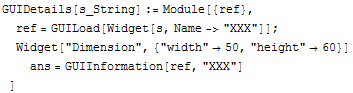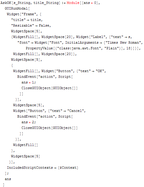 If necessary, the latest version can be downloaded from the GUIKit online site . Although the documentation for the latest version is reasonably complete, and it is possible to use it to create some impressive interfaces, I do not find it as easy to use as I would like. These notes and program fragments are designed to augment the documentation – not replace it. If you wish to use any of the (free) functions defined here, I suggest you click above to download the notebook version of this page. Feedback and suggestions regarding this page will be extremely welcome. If you use the Super Widget Package, please ensure that the copyright notice remains intact if you pass it on. Please note that the implied criticism of the GUIKit design may reflect my lack of understanding of this rather new Mathematica technology, and that GUIKit is, in any case, an interesting and usable extension to Mathematica. Relationship to J/LinkThe GUIKit is built upon J/Link – the package that links Mathematica to Java. Although J/Link is extremely powerful, GUIKit inherits two serious problems from J/Link: • Java runs as a separate process. This means that if you position a Java (i.e. J/Link) window over a notebook, and click on the notebook, you will conceal the window – even though the user is expected to respond to the window. This can give the appearance of a hung program. • Mathematica graphics can be rendered in a Java window, but if a mouse-listener is attached, the {x,y} coordinates returned are unrelated to the graphical coordinate system. See the Interactive Graphics Package for a solution to this problem for J/Link applications. Here you will see how to solve this problem for the GUIKit – which can result in some great applications! GUIKit and Mathematica ContextsUsing the GUIKit, a window definition typically consists of a nested sequence of Widget calls, in which each Widget defines some element of the window – such as a portion of text, an image, button, slider, etc. – or, indeed, the window (the "Frame" widget) that is used to wrap up all these elements. Each Widget comes with many options, and can include sections of Mathematica code inside Script blocks. This code is meant to execute in specific situations – such as when a mouse button is pressed – and provides the feedback from the GUIKit window to the rest of your Mathematica code. Unfortunately, a Widget definition can be stored and used more than once. This would typically be the case for a fairly low-level widget – such as (say) some kind of enhanced text box – it is not likely to be a problem for the average GUIKit user. However, the GUIKit design solved this problem in a very draconian way. All the symbols belonging to the Global` context in a script are moved into a private context, and the $ContextPath is stripped bare while the script is being executed! In addition, certain GUIKit functions, such as PropertyValue, actually spawn private versions of themselves which are installed in the private script context and are not equivalent to their public siblings! Because of all this overkill, some careful programming is required to use GUIKit in many applications – use the option IncludedScriptContexts -> {$Context} on GUIRun and GUIRunModal unless you find these context manipulations useful.. A simple GUIKit definitionHere is a function which displays a message in a box with "OK" and "Cancel" options. It returns a code to indicate which button was pressed: