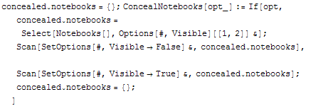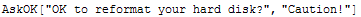 Window - what window?Return now to the AskOK function and activate it. Now click on this notebook (moving it if necessary) and observe how the GUIKit window, which is running as a separate process, is concealed. The result can be intensely confusing for an end user, who will probably conclude that your program has hung! To avoid this problem, you may wish to conceal all the Mathematica notebooks while a GUIKit window is open. Notice that this function stores the list of notebooks that it has hidden and only makes those notebooks visible again afterwards. This is because various packages, such as J/Link, use hidden notebooks as part of their operation. It is obviously important that these are not made visible as a side-effect of the operation.